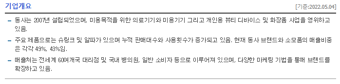 또한, 기사에서는 피부미용기기가 주력이기 때문에 탈마스크 시대에 매출이 증가할 수 밖에 없을 것이라 판단하고 있네요.